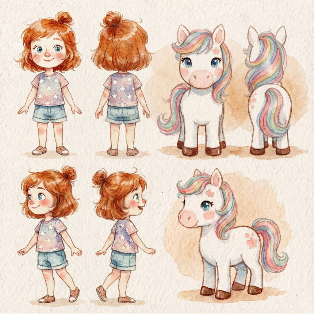 Create a combined charactersheet in a watercolor illustration style featuring a young girl and a unicorn, both depicted at the same size for accurate size reference in future image generation. The girl is a charming child with short, wavy reddish-brown hair tied in a small topknot, large expressive blue eyes, rosy cheeks with freckles, wearing a pastel star-patterned t-shirt and denim shorts with casual slip-on shoes. Show her in multiple poses: front, back, side, and three-quarter views, including a close-up of her face with a gentle smile and lively expression. The unicorn is a small, adorable creature with a white coat, large blue eyes, rosy cheeks, and a soft pink muzzle. It has a flowing mane and tail in pastel rainbow colors with subtle curls, decorated with small flower markings on its body and brown hooves. Present the unicorn in front, back, side, and three-quarter views, matching the girl’s size exactly. Both characters are set against a textured off-white watercolor paper background with soft beige watercolor washes behind the unicorn for subtle contrast. The lighting is soft and natural, enhancing the delicate watercolor textures and gentle color palette. The overall vibe is whimsical, friendly, and suitable for a children’s storybook character reference sheet. Ensure the composition is spacious and clear, making it an ideal size and format for detailed character reference and future image generation.