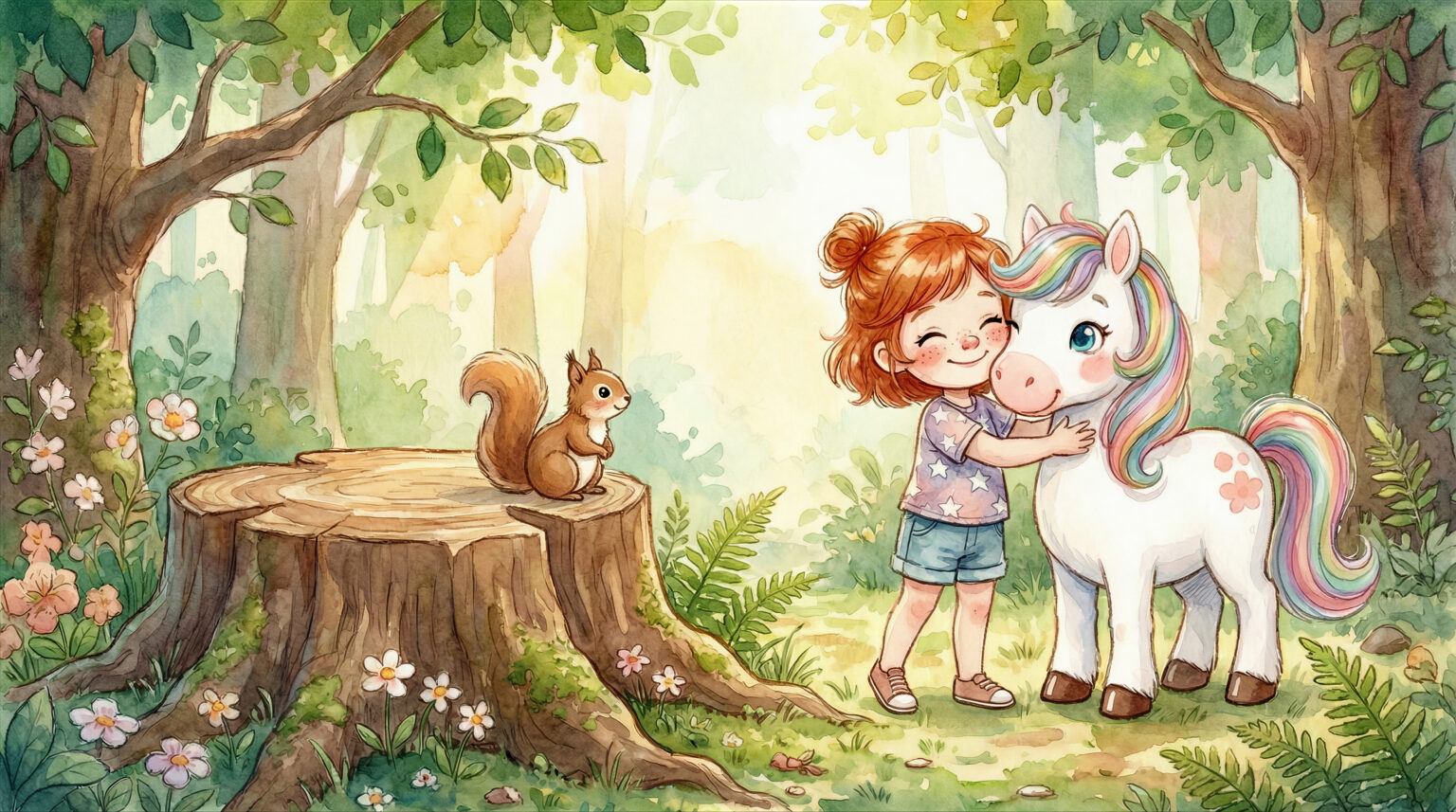 „Waldrand bei mildem Tageslicht. Das Mädchen, etwa 4 Jahre alt, lockige Haare, bunte Kleidung, stolpert erschrocken vor Schreck einen Schritt zurück. Vor ihr sitzt ein kleines weißes Pony mit bunter Mähne, bitterlich weinend. Kein Horn ist zu sehen — nur das traurige Pony. Im Hintergrund beginnt der Wald, mit Bäumen und neugierigen Tieren…“