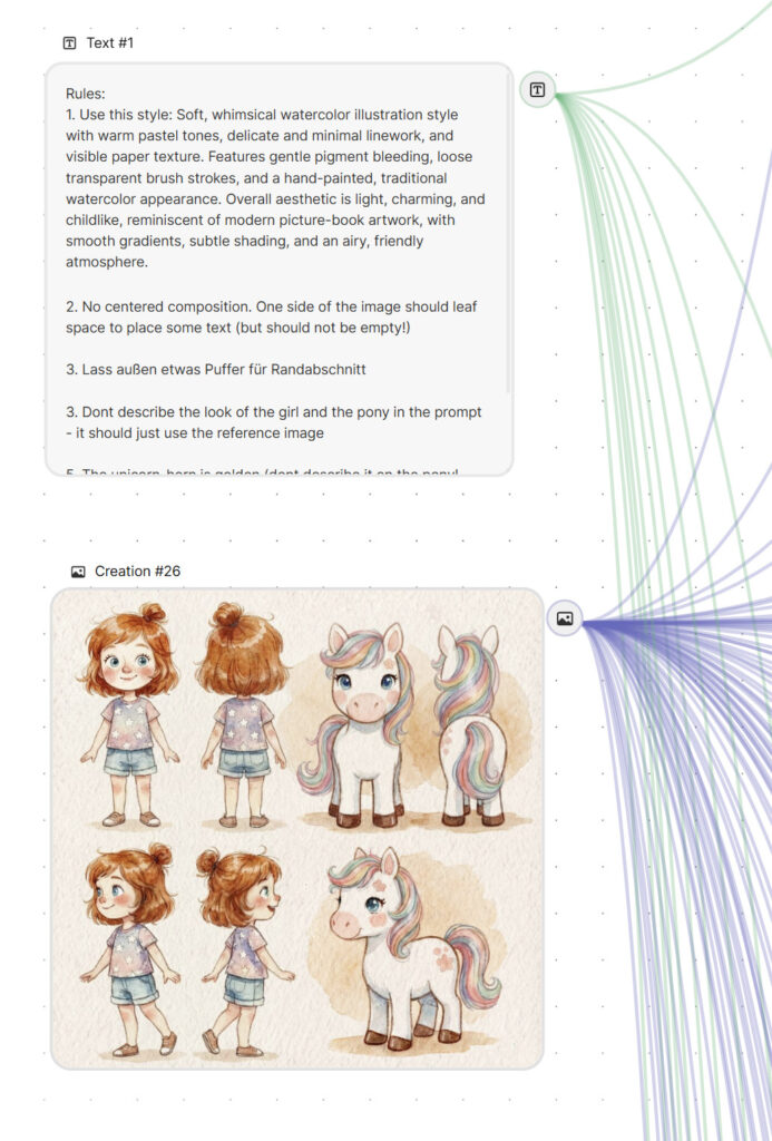 Der Effekt: Die KI weiß jetzt nicht nur, wie die Figuren aussehen, sondern auch, dass Mathilda dem Pony genau bis zur Schulter reicht. Das spart dir später hunderte Fehlversuche bei der Proportion & Größe.