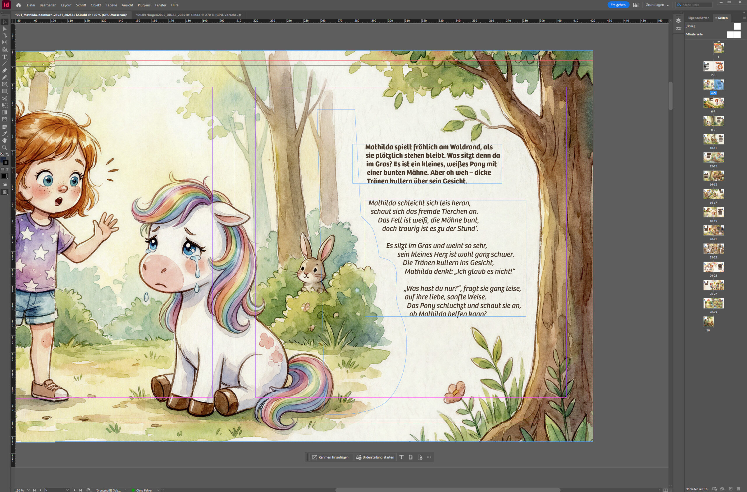 Wichtiges Learning: Ich habe hier noch nicht die finalen Reime geschrieben. Der Fokus lag rein auf dem visuellen Storytelling: Was passiert auf dem Bild? Wer ist zu sehen? Die Texte entstanden erst ganz zum Schluss, passend zu den fertigen Illustrationen. Das verhindert, dass man Text schreibt, den man später bildlich gar nicht umsetzen kann.