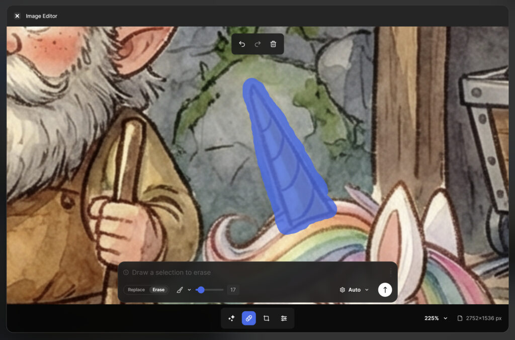Statt neu zu generieren (und den guten Rest zu verlieren), nutze ich die Bearbeitungsfunktionen direkt in Freepik Spaces. Im Editing-Modus reicht ein simpler Prompt: „Remove horn“ oder „Replace with small golden unicorn-horn“. Das spart Zeit und Nerven. Dafür nutze ich Google Nano Banana Pro in der gleichen 2K Auflösung – auf diesem Weg verliere ich durch das Editieren nicht viel Bildqualität.
