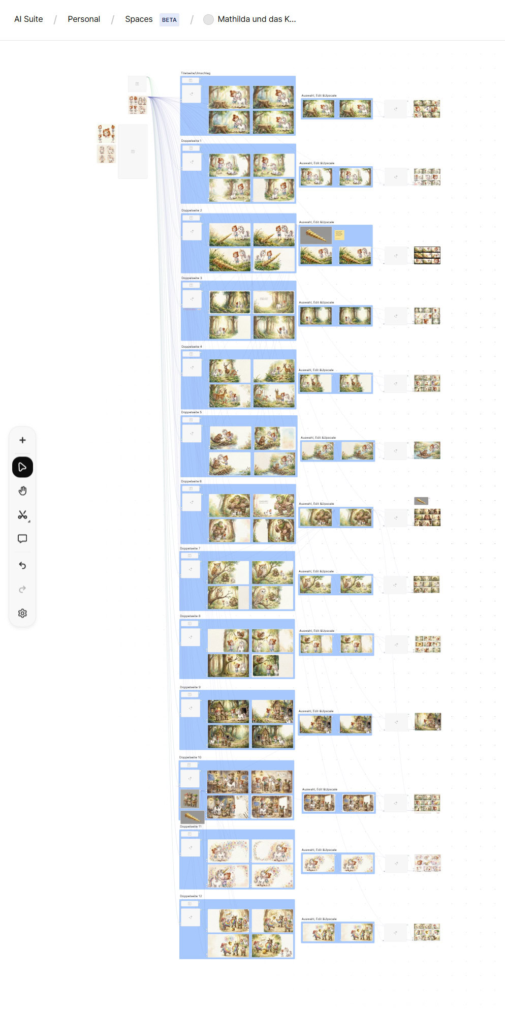 Sobald die Optik in Flux.2 stand, bin ich für die Massenproduktion der 12 Doppelseiten zu Google Nano Banana Pro gewechselt. Dieses Modell ist extrem stark darin, Bild-Kontext zu verstehen. Aber ich habe einen entscheidenden Zwischenschritt eingebaut: