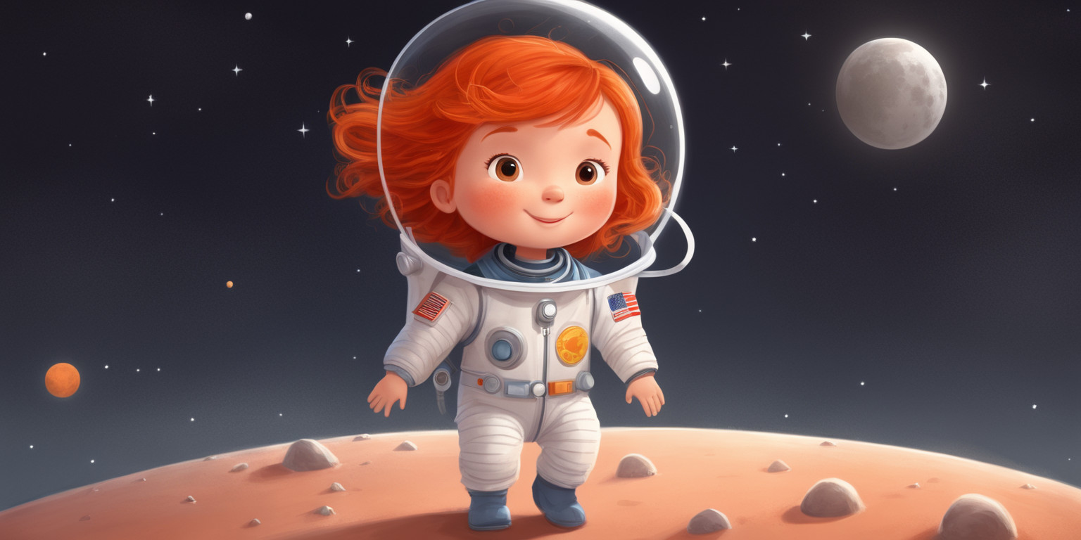 a storybook illustration of 3 year old redhaired ms little girl as a astronaut on the moon, in the style of goro fujita and Iwona Lifsches