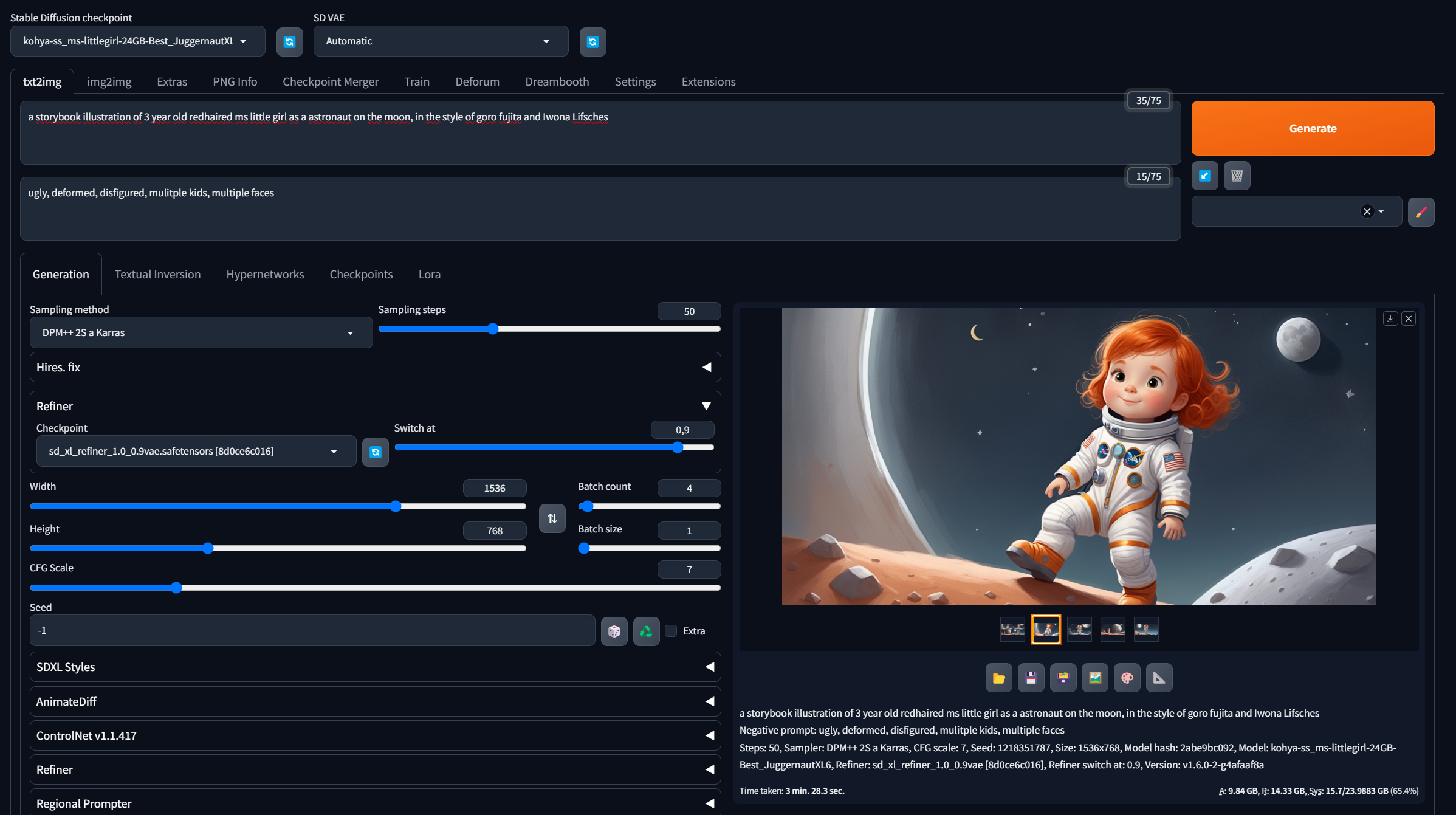 Um dieses Traumprojekt zu verwirklichen, wandte ich mich der KI zu. Ein maßgeschneidertes Stable Diffusion Modell, trainiert mit Bildern meiner Tochter, ermöglichte es mir, wunderschöne und konsistente Illustrationen zu generieren. ChatGPT half mir dabei, die Geschichte zu entwickeln und in Worte zu fassen, ohne dass ich mich mit Reimen herumschlagen musste.