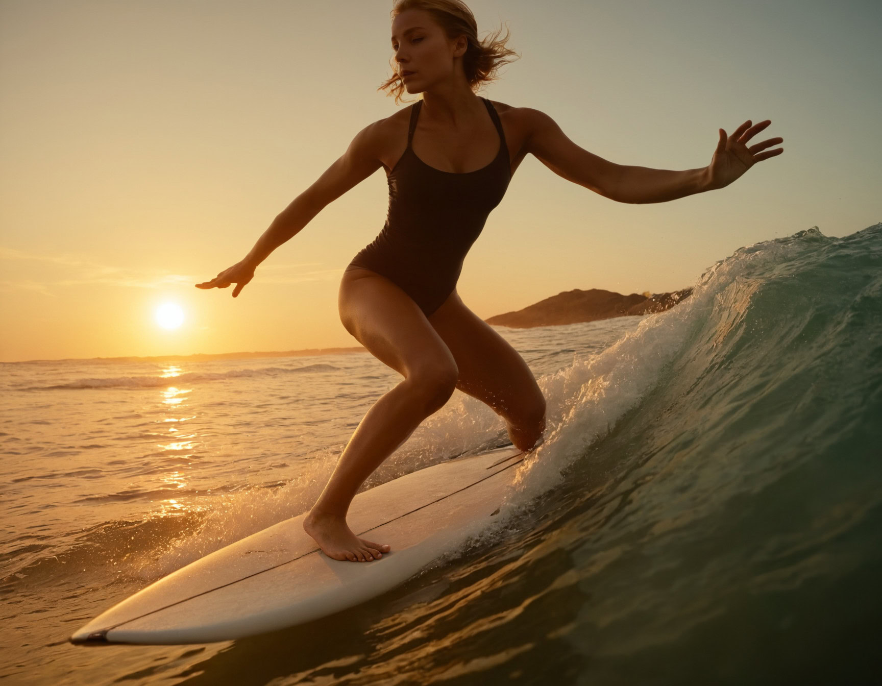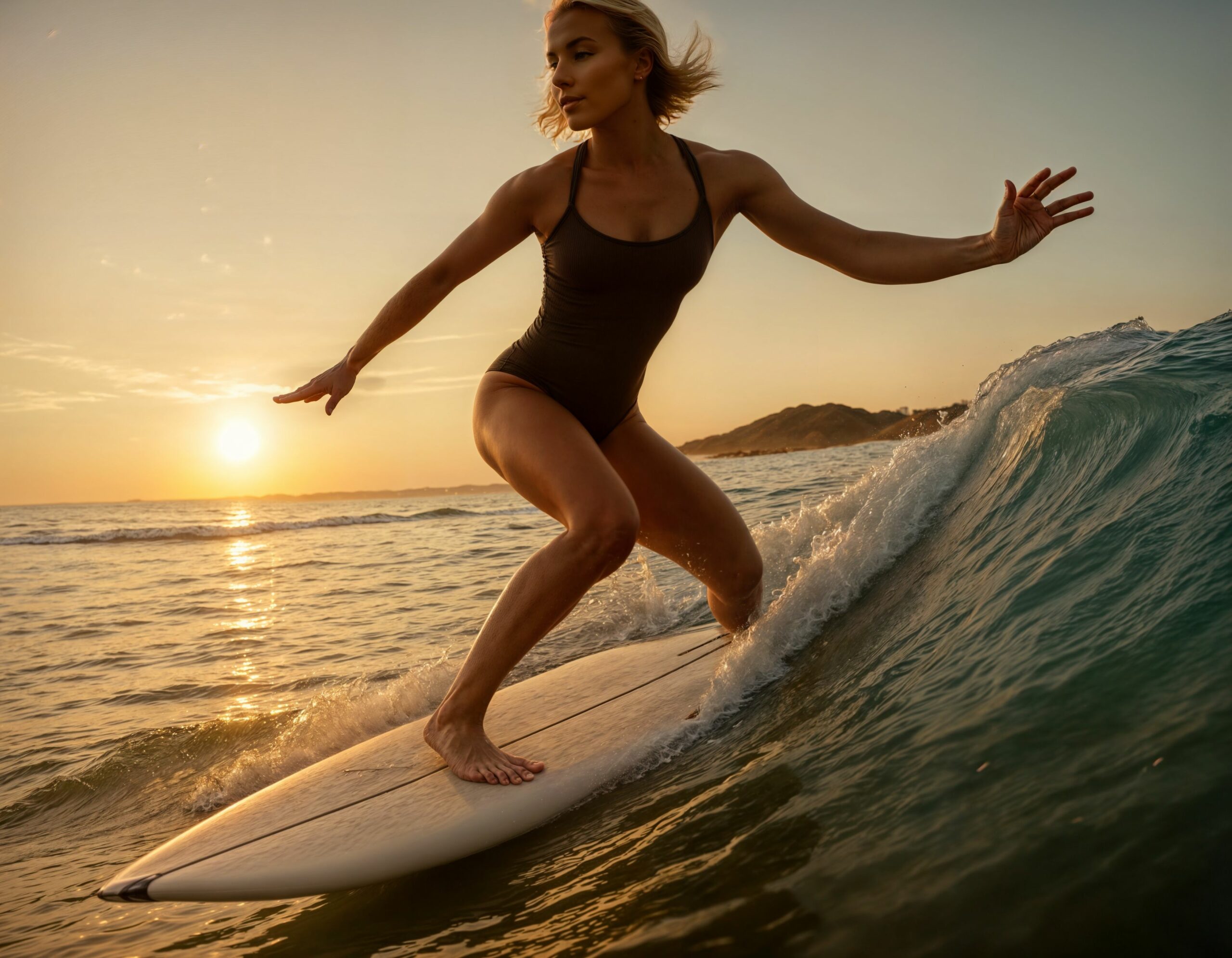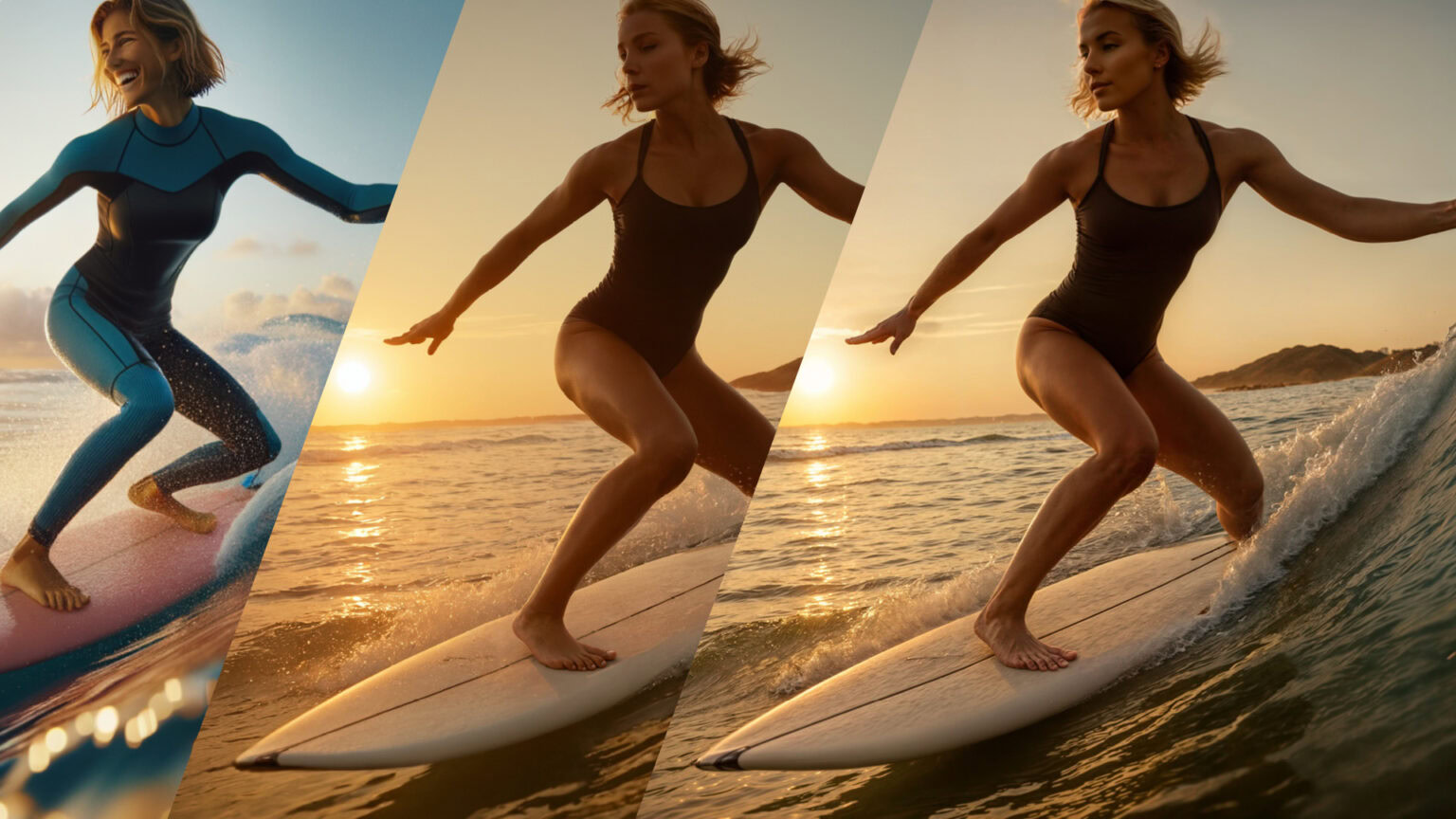 Vor Beginn der KI Weiterbildung experimentierte ich bereits mit Bildgenerierungs-Tools wie DALL-E, jedoch ohne professionelle Anleitung blieben die Ergebnisse qualitativ durchschnittlich. Das erste Bild in der Bilderserie veranschaulicht dies – ein unscharfes, detailarmes KI-generiertes Surferbild meiner Anfängerversuche.