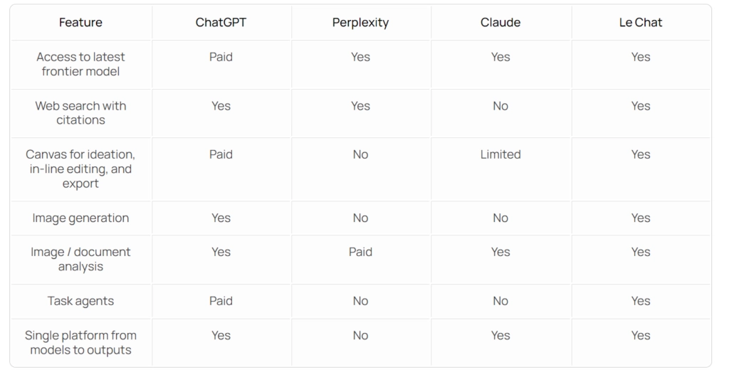 Mistral Features im Vergleich zu ChatGPT, Claude, Perplexity