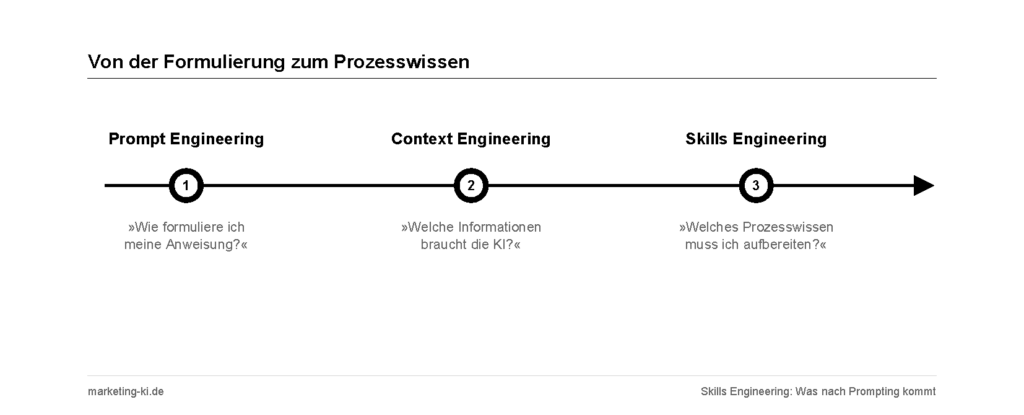 Skills Engineering fragt: Welches Prozesswissen muss die KI haben, um meine Arbeit zu verstehen? Der Fokus liegt nicht auf Fakten, sondern auf Vorgehensweisen, Qualitätskriterien und Entscheidungslogiken. Nicht „was wir wissen“, sondern „wie wir arbeiten“.