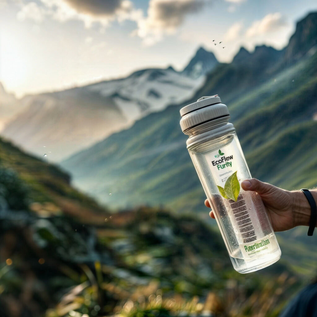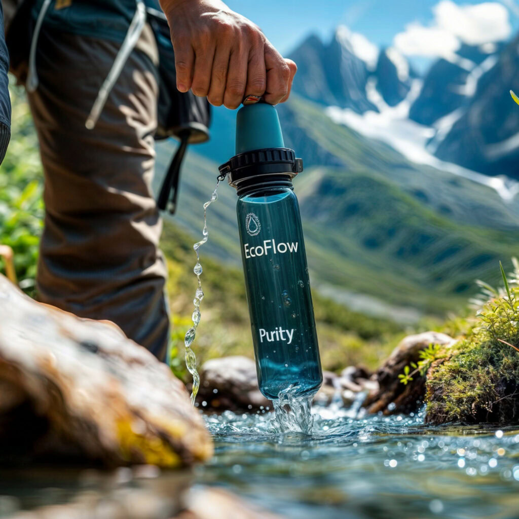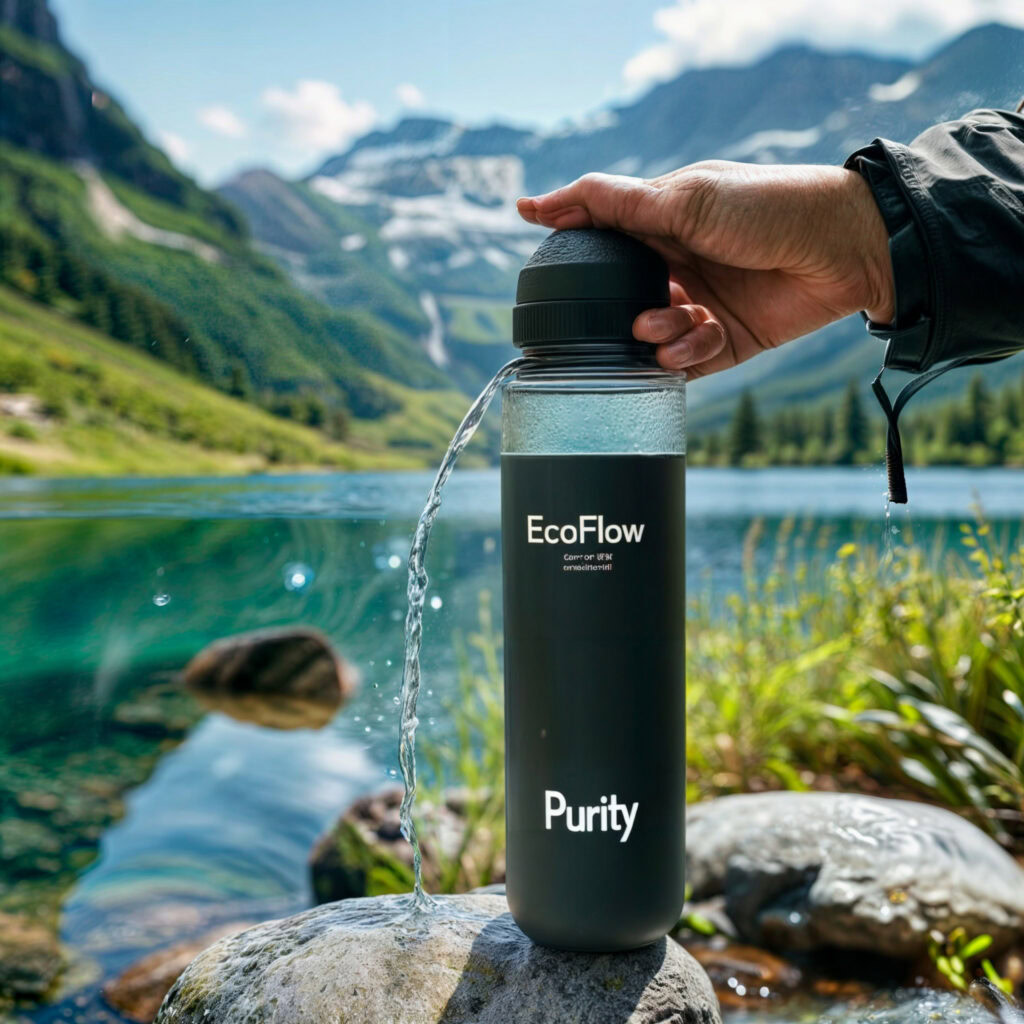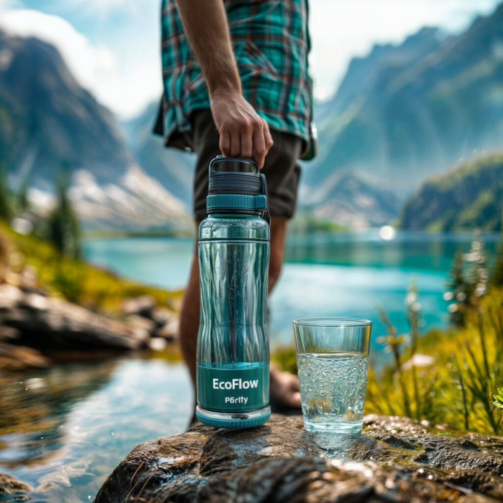 Bildvorschlag: Ein Split-Screen-Bild: Auf der linken Seite sieht man eine Person, die den kompakten EcoFlow Purity an einem malerischen Bergsee benutzt, um Wasser zu filtern. Auf der rechten Seite zeigt ein Close-up die innovative Technologie des Filters, während im Hintergrund eine Smartphone-App mit Wasserqualitätsdaten zu sehen ist.