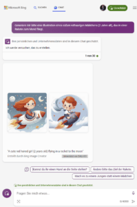 Georg Neumann, bietet uns dabei eine weise Orientierung. Während Dall-E 3 durch seine beeindruckende Interpretation von Textprompts glänzt, wirft die Inkonstanz in der Bildqualität einen Schatten auf die ansonsten beeindruckende Technologie. In anderen Tools würde so ein Satz „Generiere mir bitte eine Illustration eines süßen rothaarigen Mädchens (2 Jahre alt), das in einer Rakete zum Mond fliegt.“ nicht gut funktionieren. Erst recht nicht auf deutsch. In Dall-E 3 liefert es aber gute Ergebnisse: