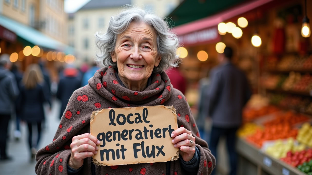 - Textwiedergabe: Funktioniert auf Englisch deutlich besser als auf deutsch. „Lokal generiert mit Flux“ konnte ich nicht fehlerfrei generieren „generated locally with flux“ schon.
