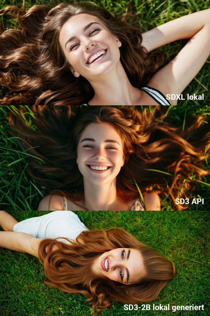 Besonders auffällig sind die Schwierigkeiten bei der Generierung weiblicher Körper. Das Modell scheint in diesem Bereich massiv eingeschränkt zu sein, was zu bizarren Verzerrungen und anatomisch unmöglichen Darstellungen führt. Der Prompt „photo of a young woman lying down in grass“ ist inzwischen zu einem Meme in der Community geworden, da die Ergebnisse oft unfreiwillig komisch oder sogar verstörend wirken.