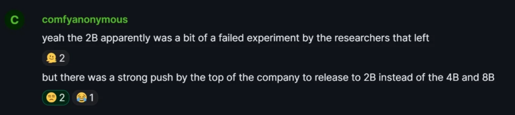 Wie ein Entwickler hinter ComfyUI, der auch an SD3 mitgearbeitet hat, nun enthüllt hat, gab es innerhalb von Stability AI unterschiedliche Ansichten darüber, welche Version von SD3 veröffentlicht werden sollte (hier gehts zum Reddit-Post). Während das Forschungsteam ursprünglich eine 2B-Variante als experimentellen Zwischenschritt entwickelt hatte, drängte die Unternehmensführung am Ende auf die Veröffentlichung genau dieser Version anstelle der leistungsstärkeren 4B- und 8B-Modelle.